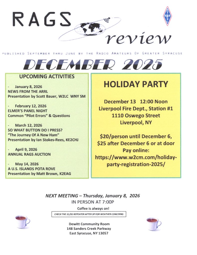 The Radio Amateurs of Greater Syracuse (RAGS) is an ARRL affiliated Amateur (ham) Radio Club serving the Central New York area. The Club was incorporated in 1955. We provide fellowship, technical advice, and public service communications to promote and support amateur radio in our community.